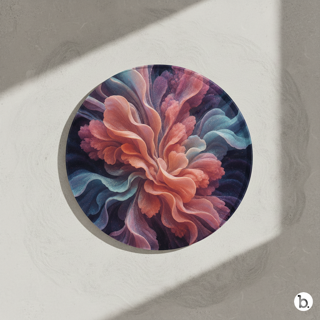 A twilight blossom of coral, indigo, and dusty rose unfurls against a deep, starlit void.